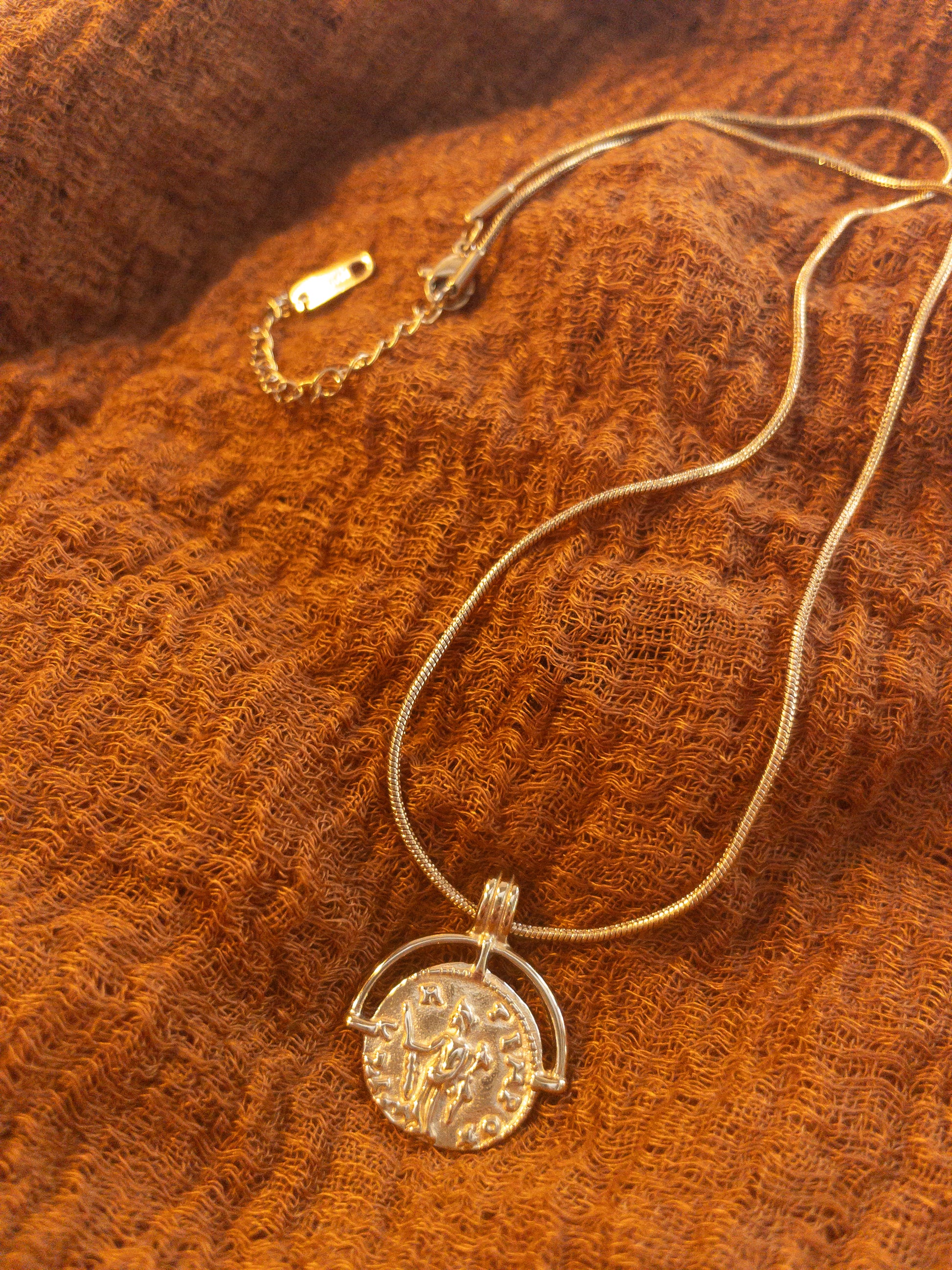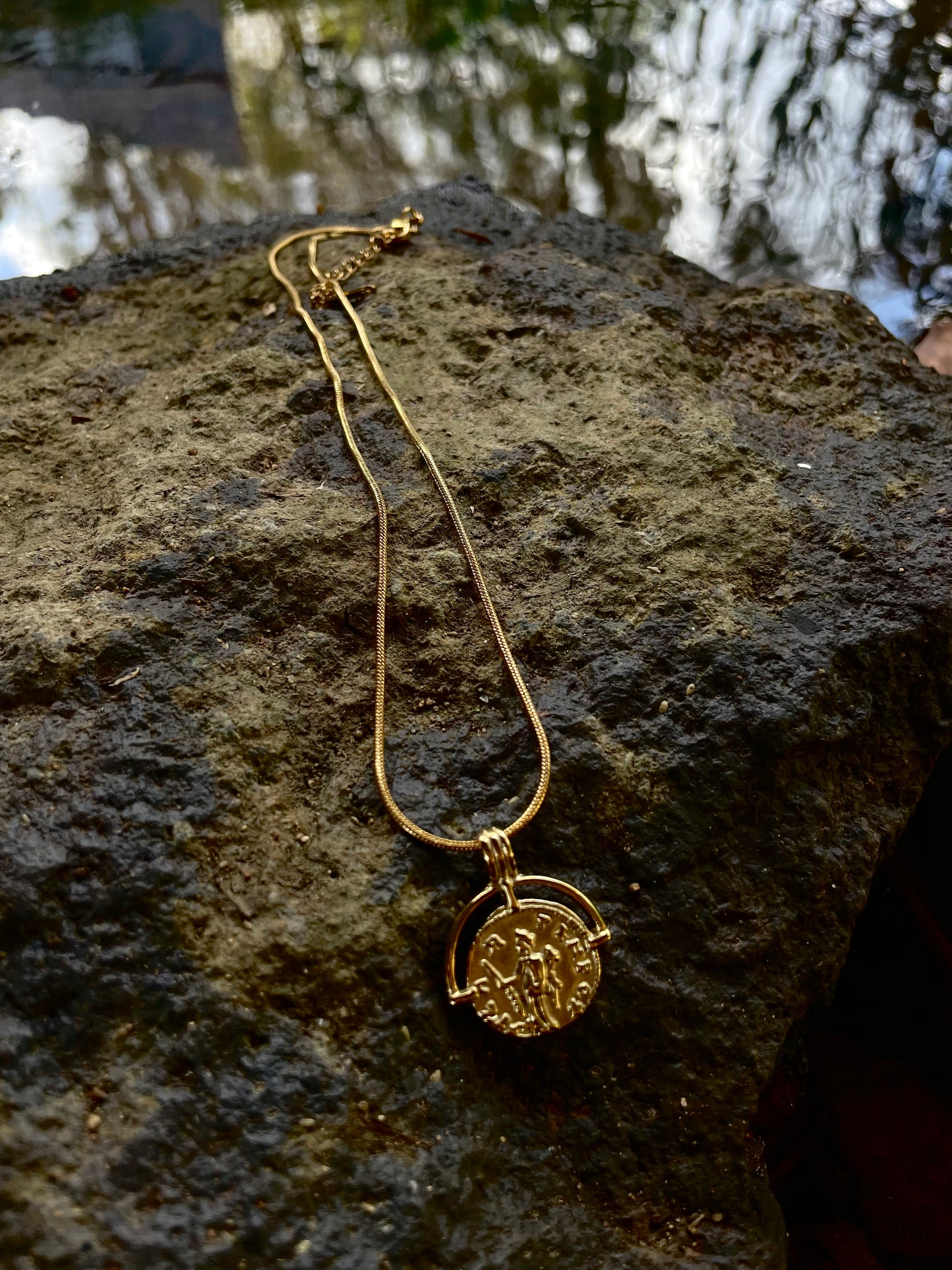 This 18k gold plated necklace features a sleek snake chain, offering a smooth, fluid drape against the skin. The circular pendant, adorned with intricate detailing, adds a touch of depth and character to the minimalist design.