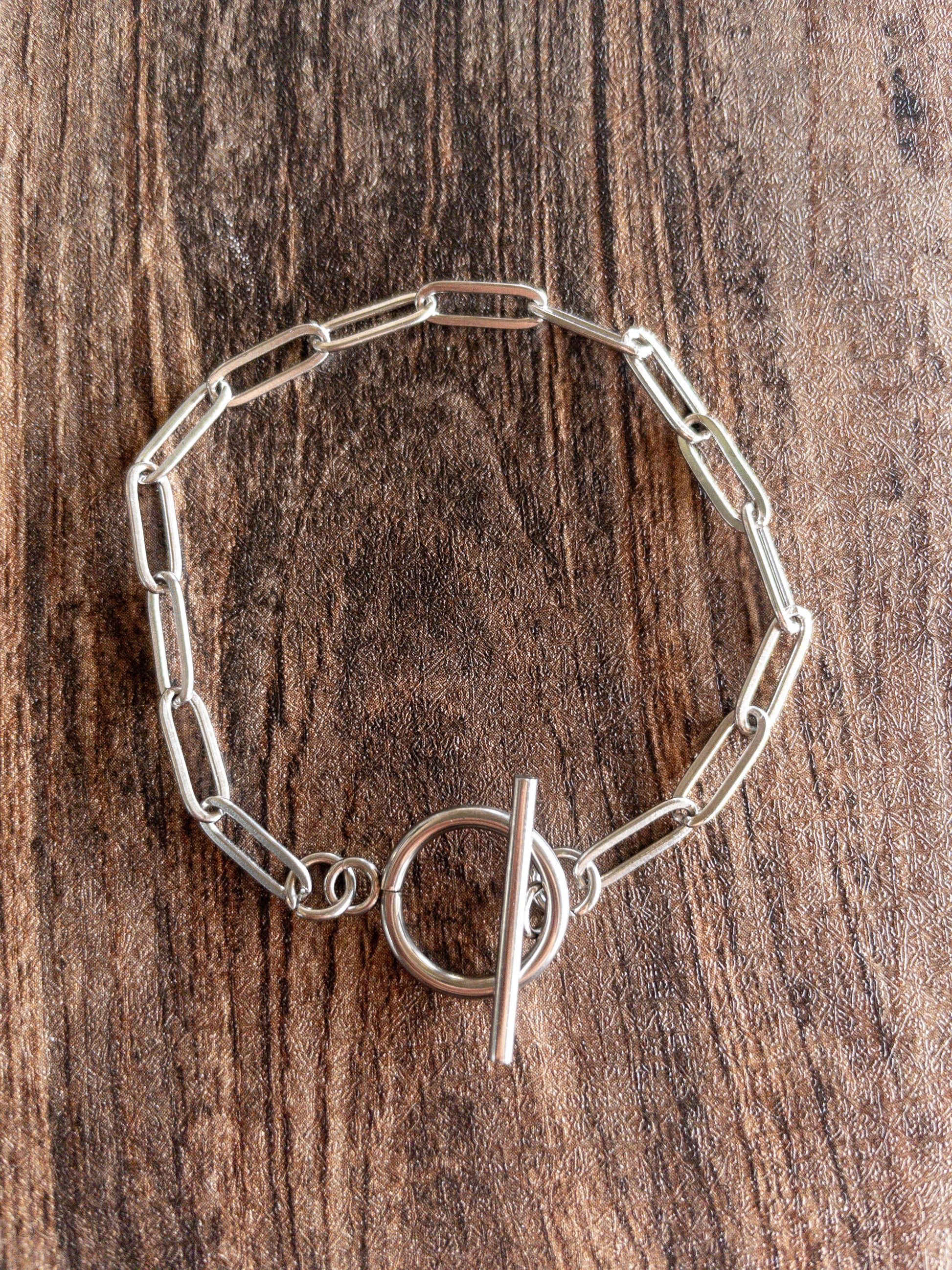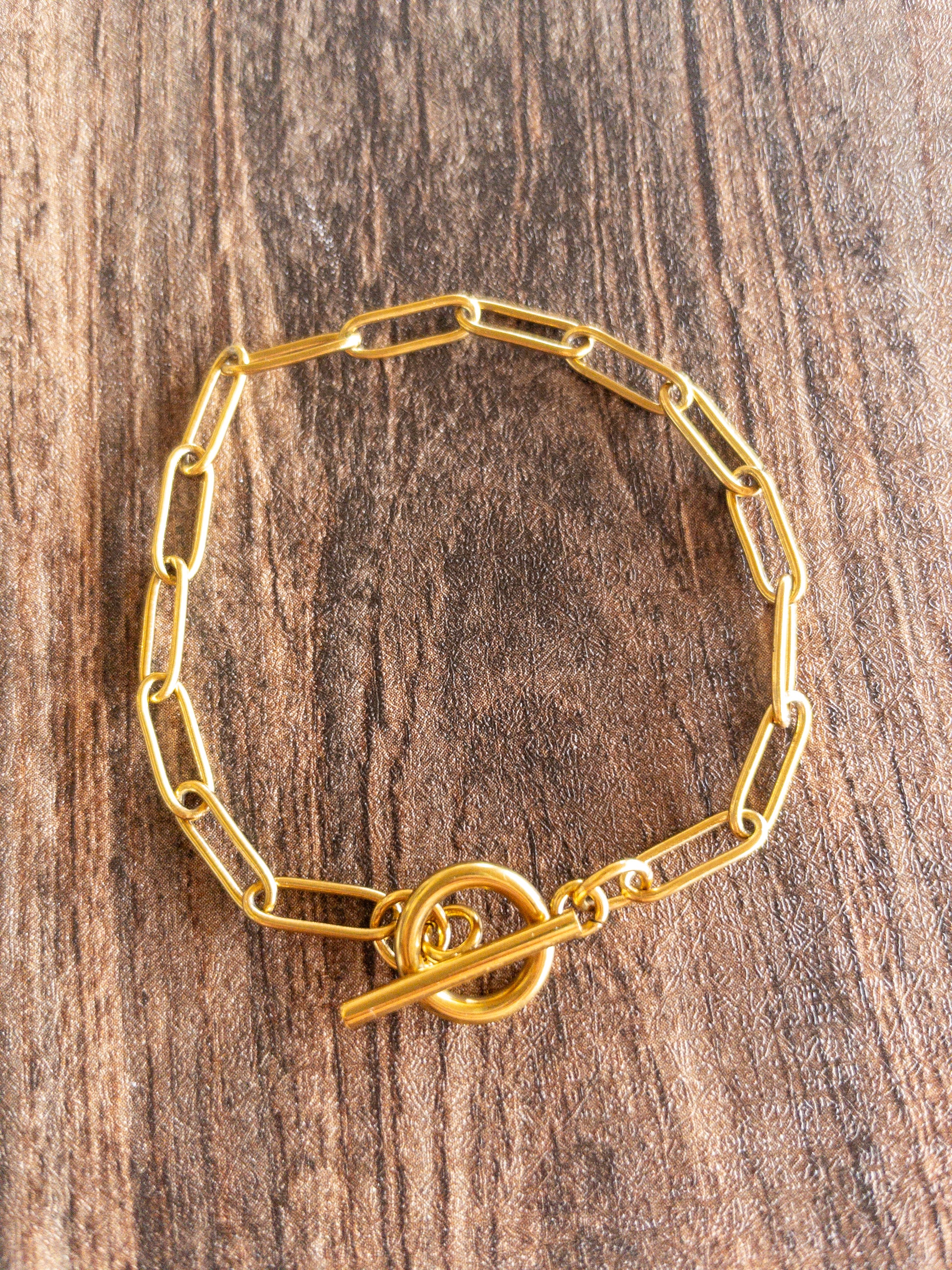 This bracelet, available in both 18k gold-plated and stainless steel, features a modern link chain with a sleek toggle clasps. The clean lines and refined structure make it a versatile piece—perfect for stacking or wearing solo for a minimalist statement.
