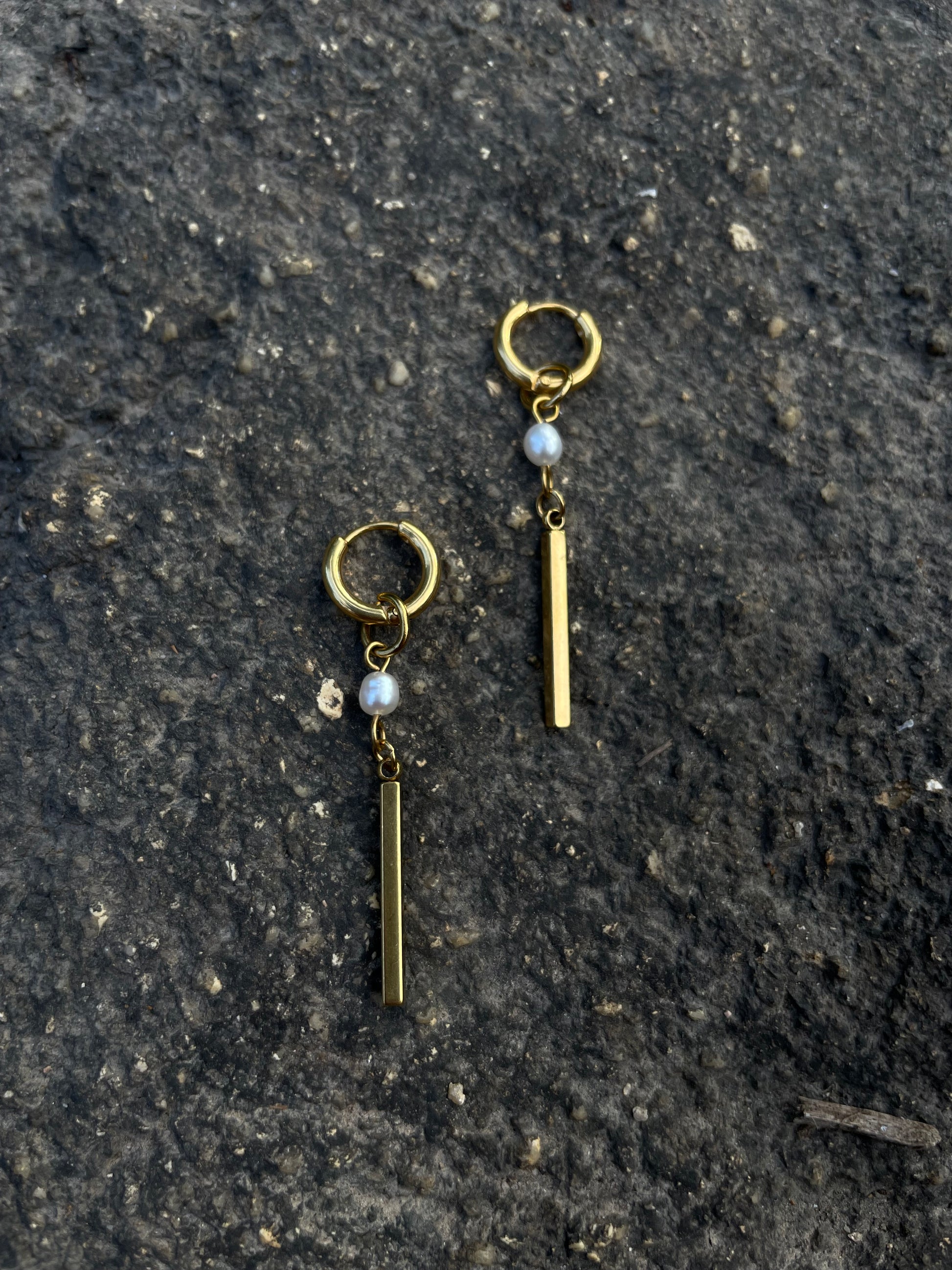This pair of earrings, available in 18k gold plating and stainless steel, features a small hoop that elegantly dangles a freshwater pearl and a sleek bar. A perfect balance of simplicity and sophistication, these earrings add a refined touch to both casual and formal looks.
