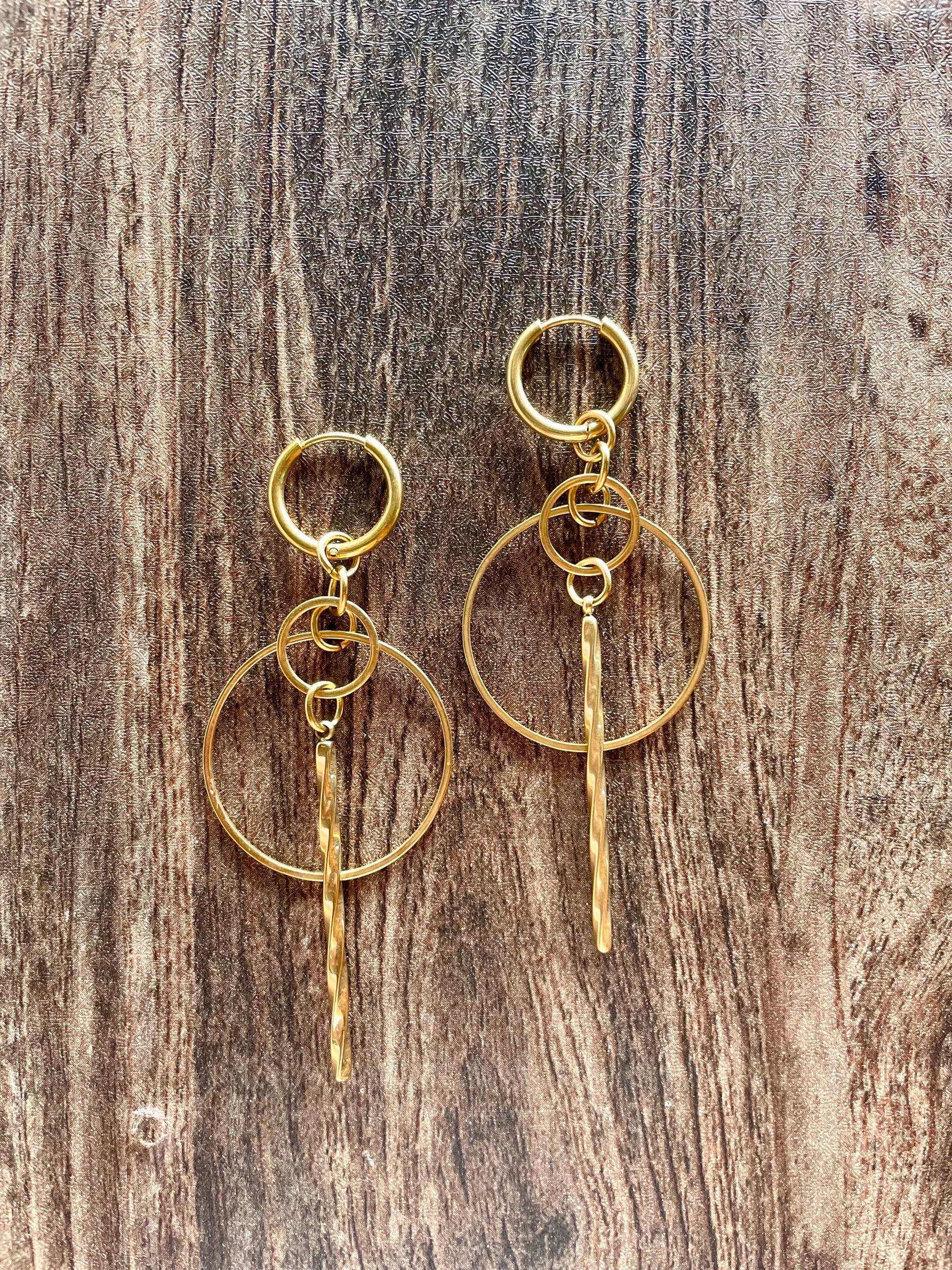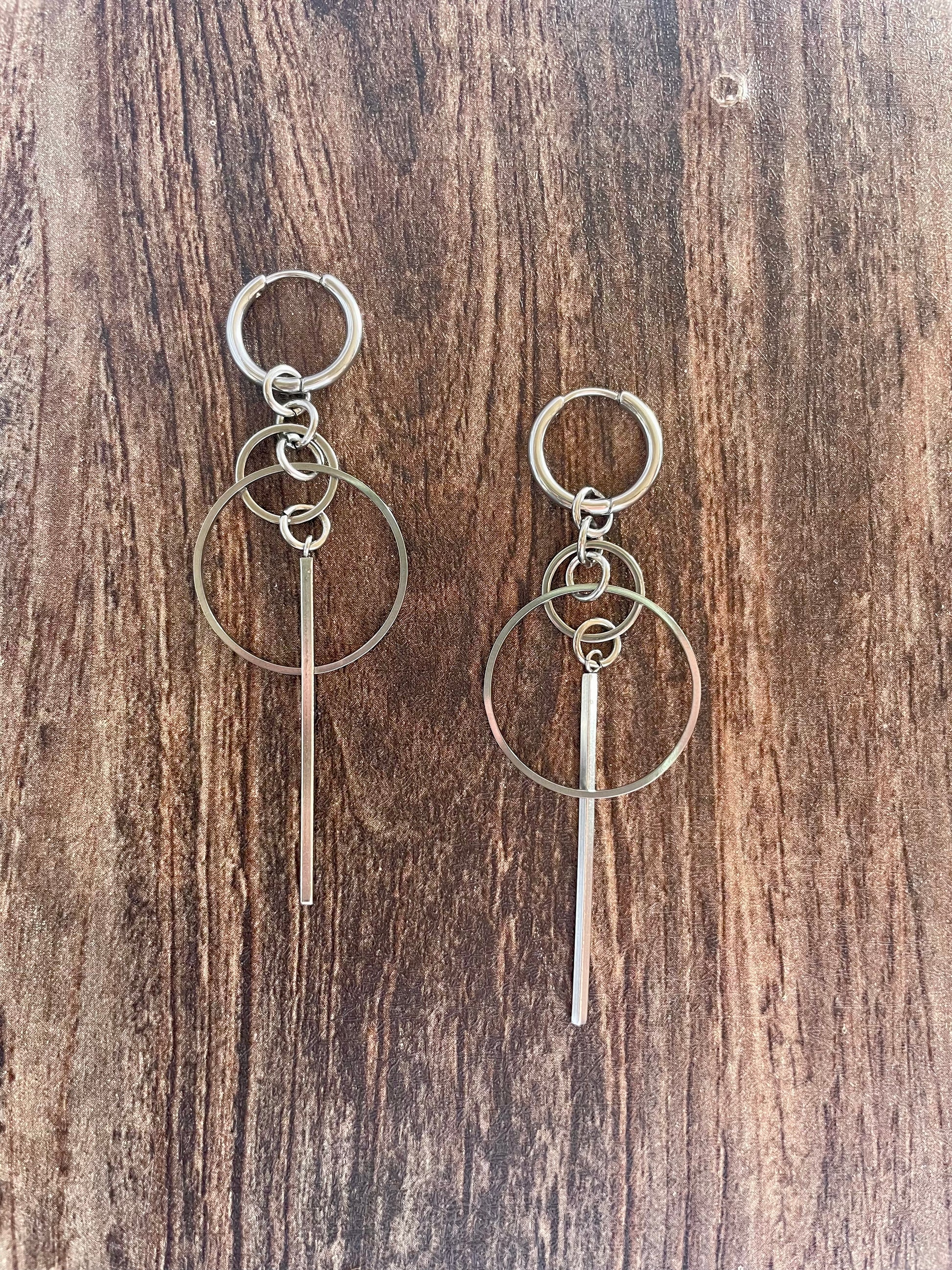 These earrings, available in both 18k gold plating and stainless steel, feature a bold, layered design with a hoop that drops a small circle, a large circle, and a twisted bar for added texture. This striking combination of shapes and elements creates a modern yet timeless look, perfect for adding a unique flair to both everyday wear and special occasions. The balance of smooth and twisted details makes them an essential piece for those seeking something both fashionable and versatile.