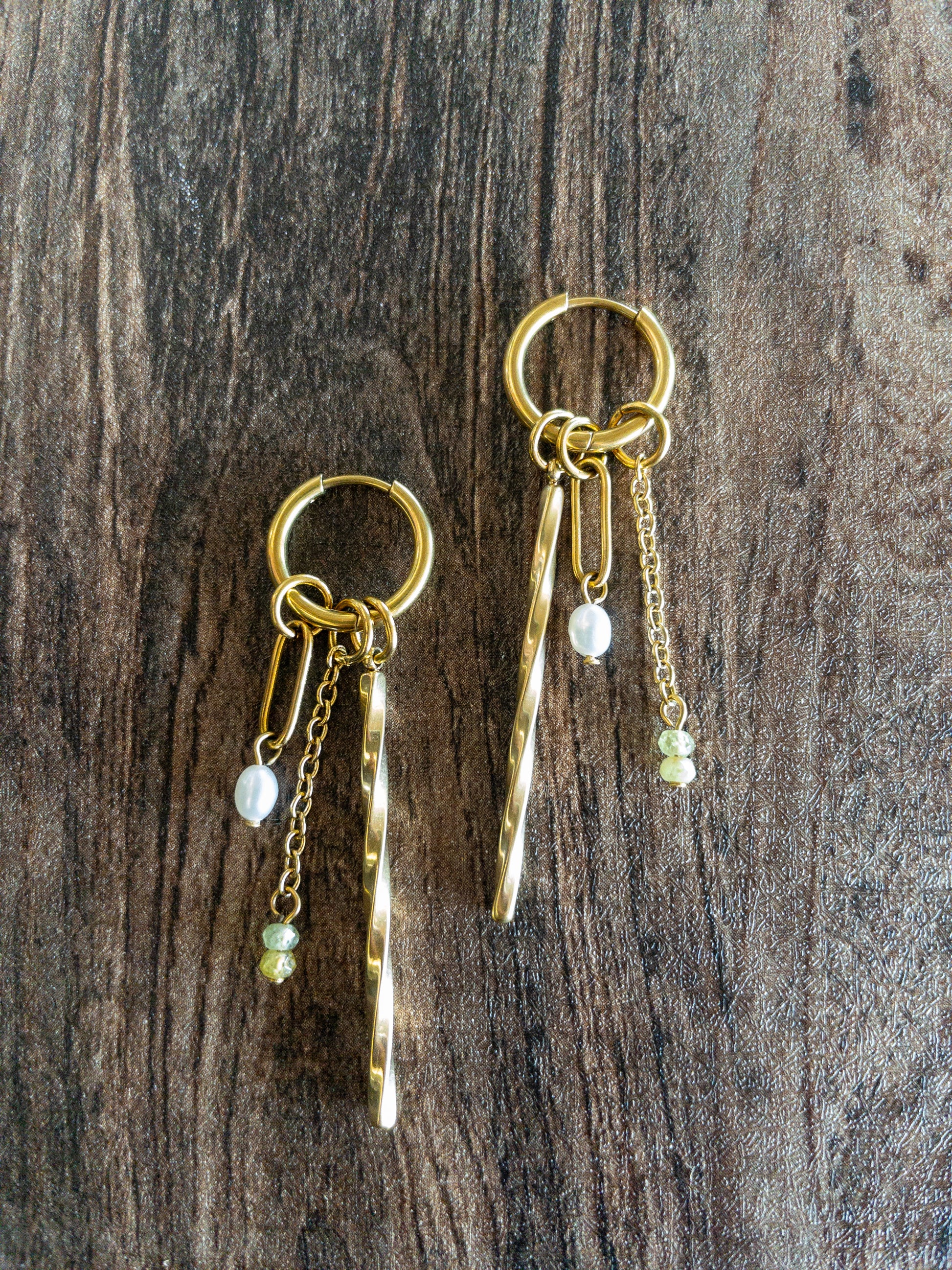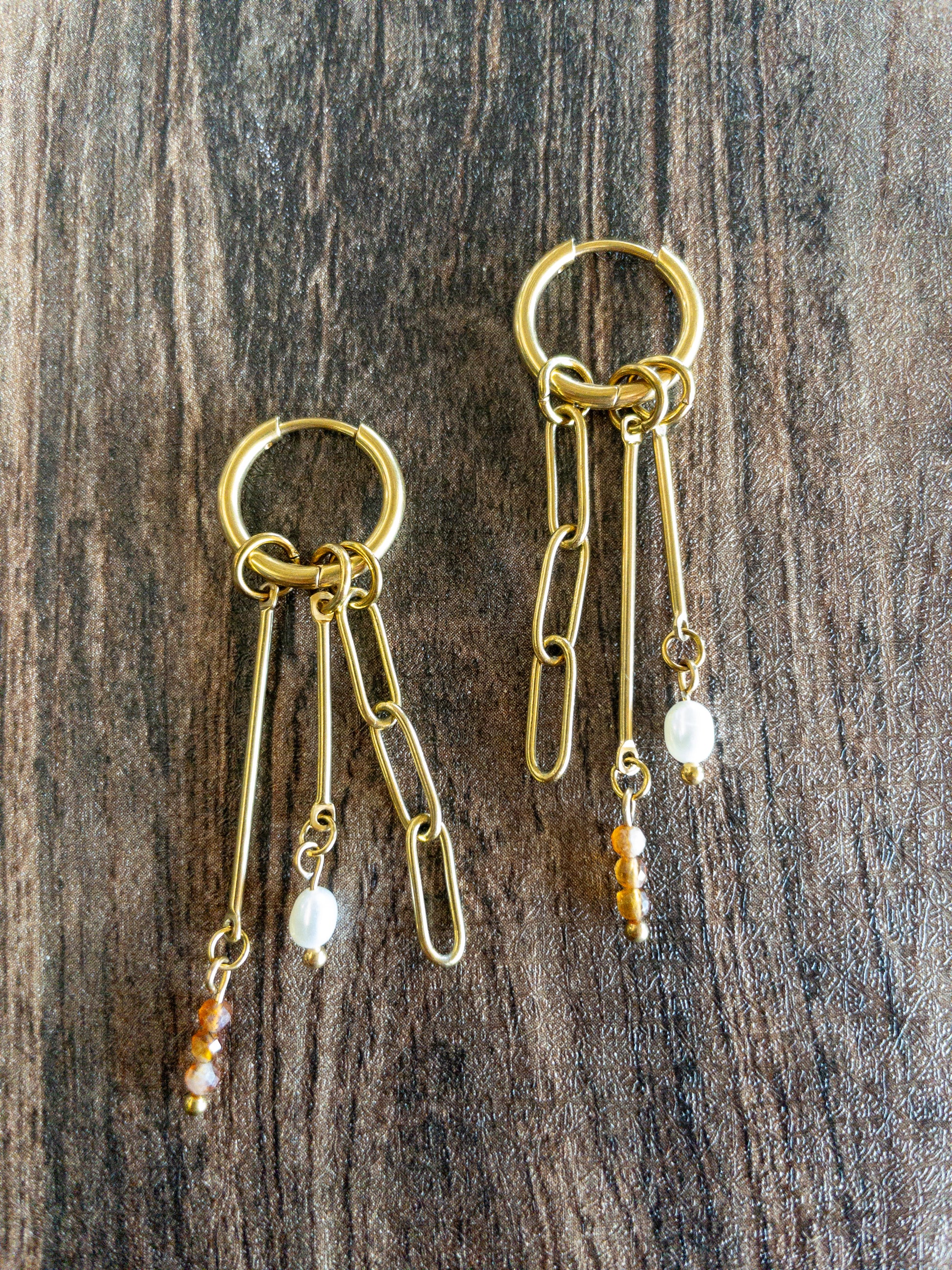 These earrings, available in green garnet and fire opal with freshwater pearls, showcase a striking design that merges elegance with a modern edge. A small hoop holds the bar pendant and cascading delicate chains, adorned with crystal charms, creating layers of movement and dimension. Perfect for adding a sophisticated yet contemporary flair to any outfit, these earrings embody timeless beauty with a bold, modern twist.