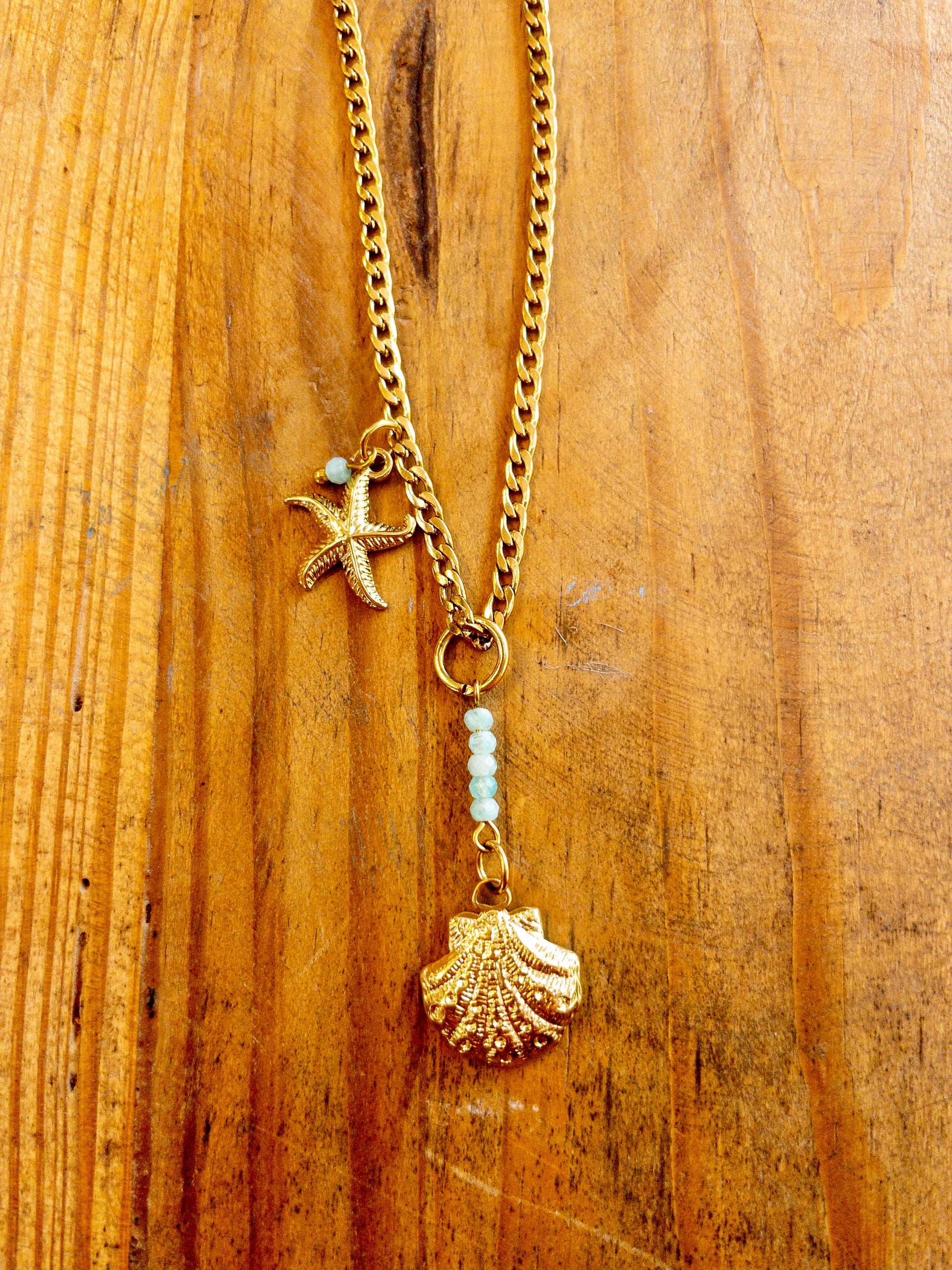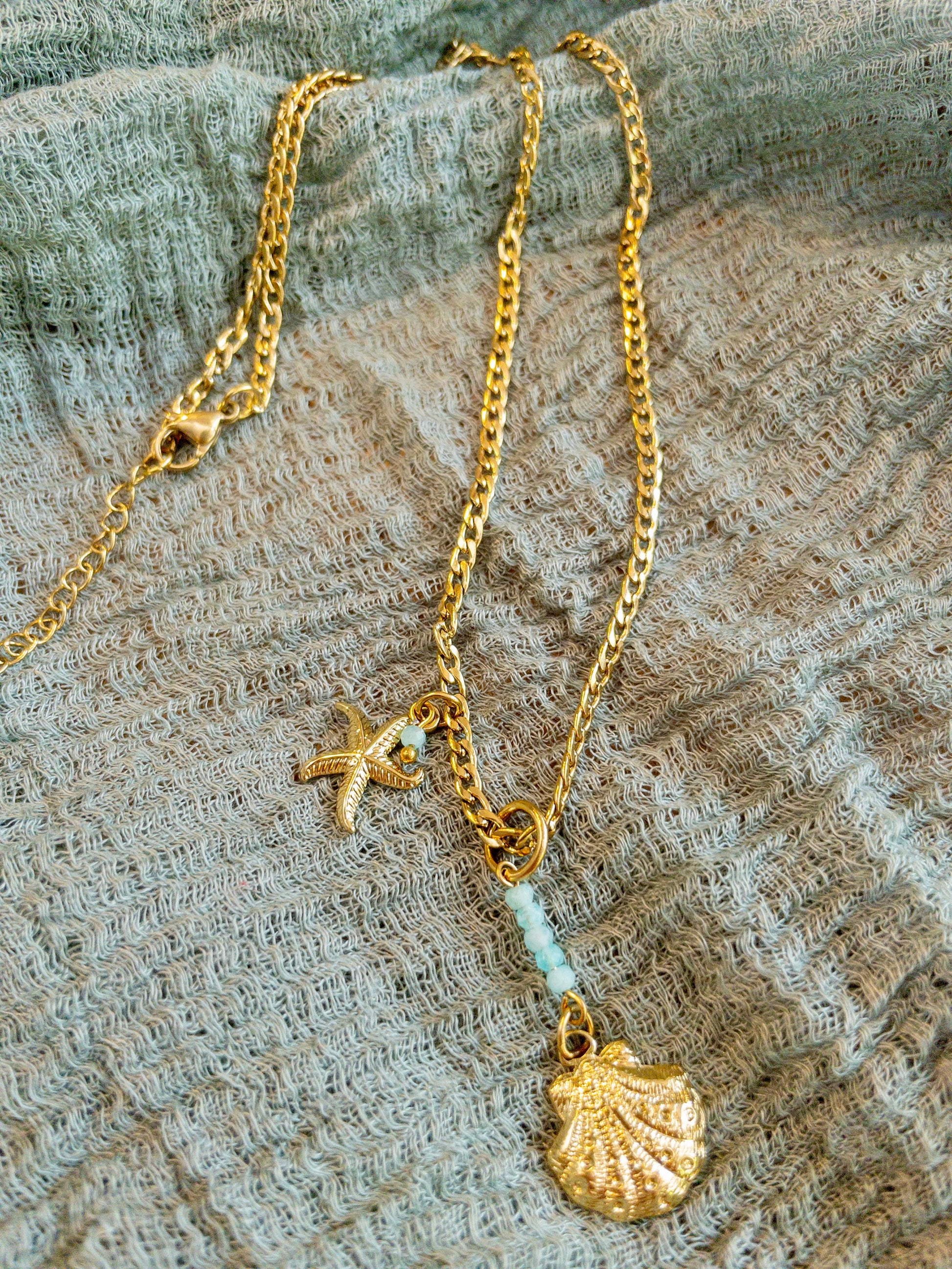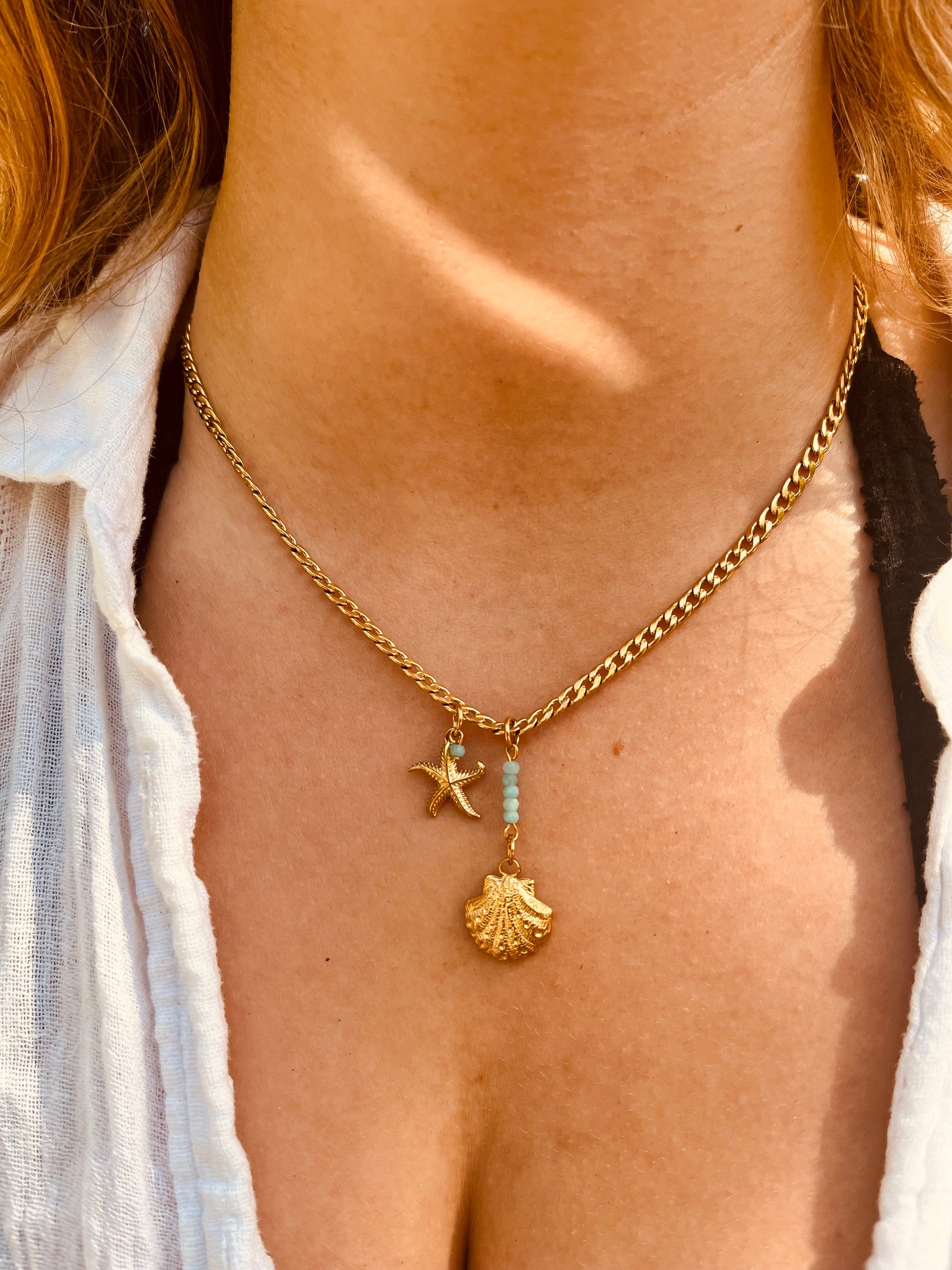 This 18k gold-plated necklace combines two pendants each adding a unique charm to the design. On the left, a small starfish, highlighted by Amazonite crystal, brings a natural, coastal feel. In the centre, five Amazonite stones lead to a delicate shell pendant, creating a harmonious blend of elegance and nature.