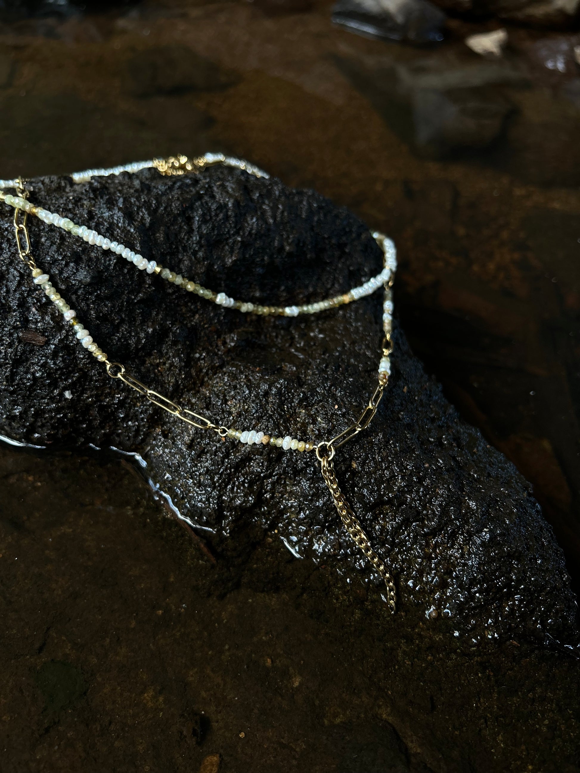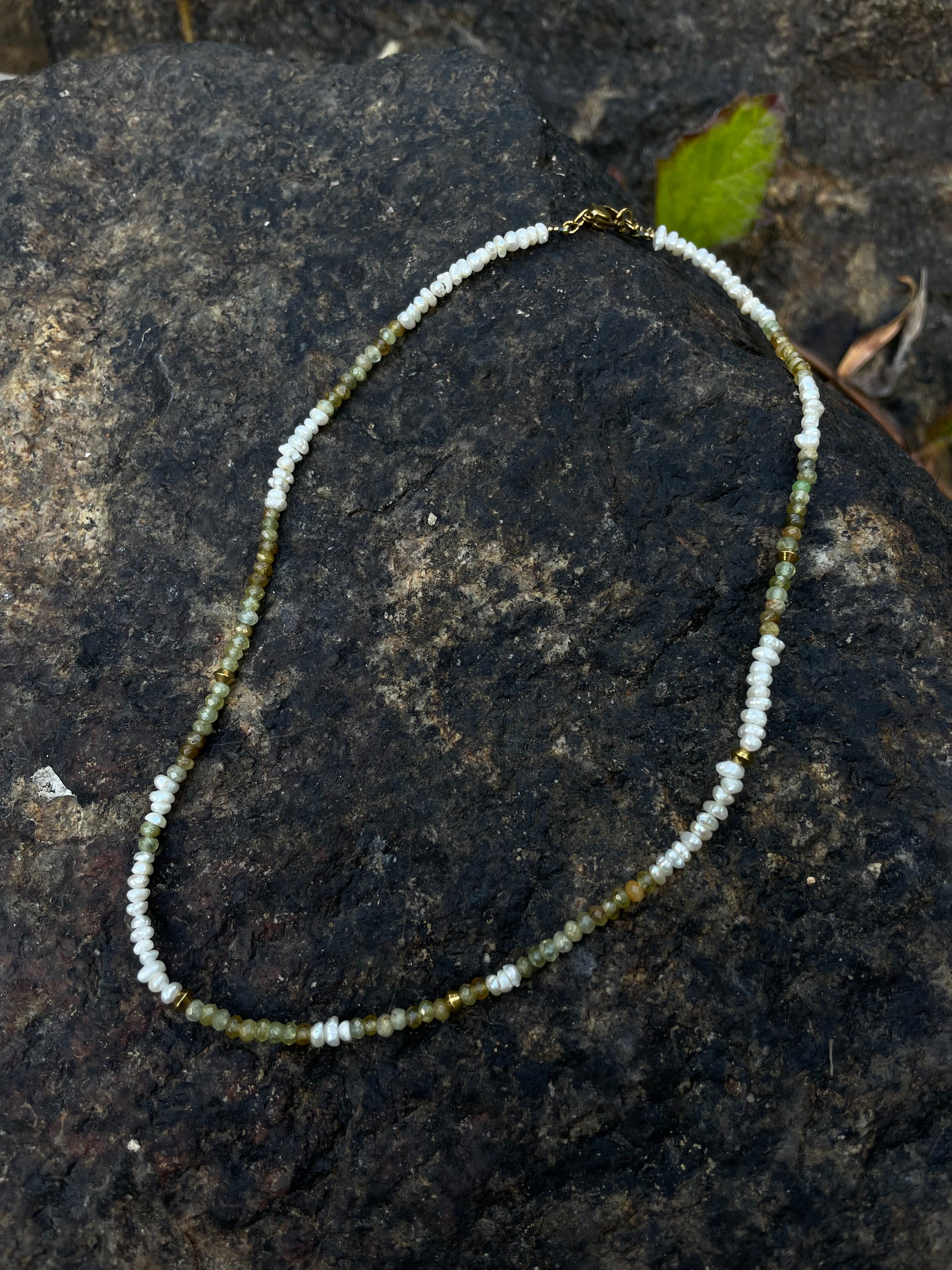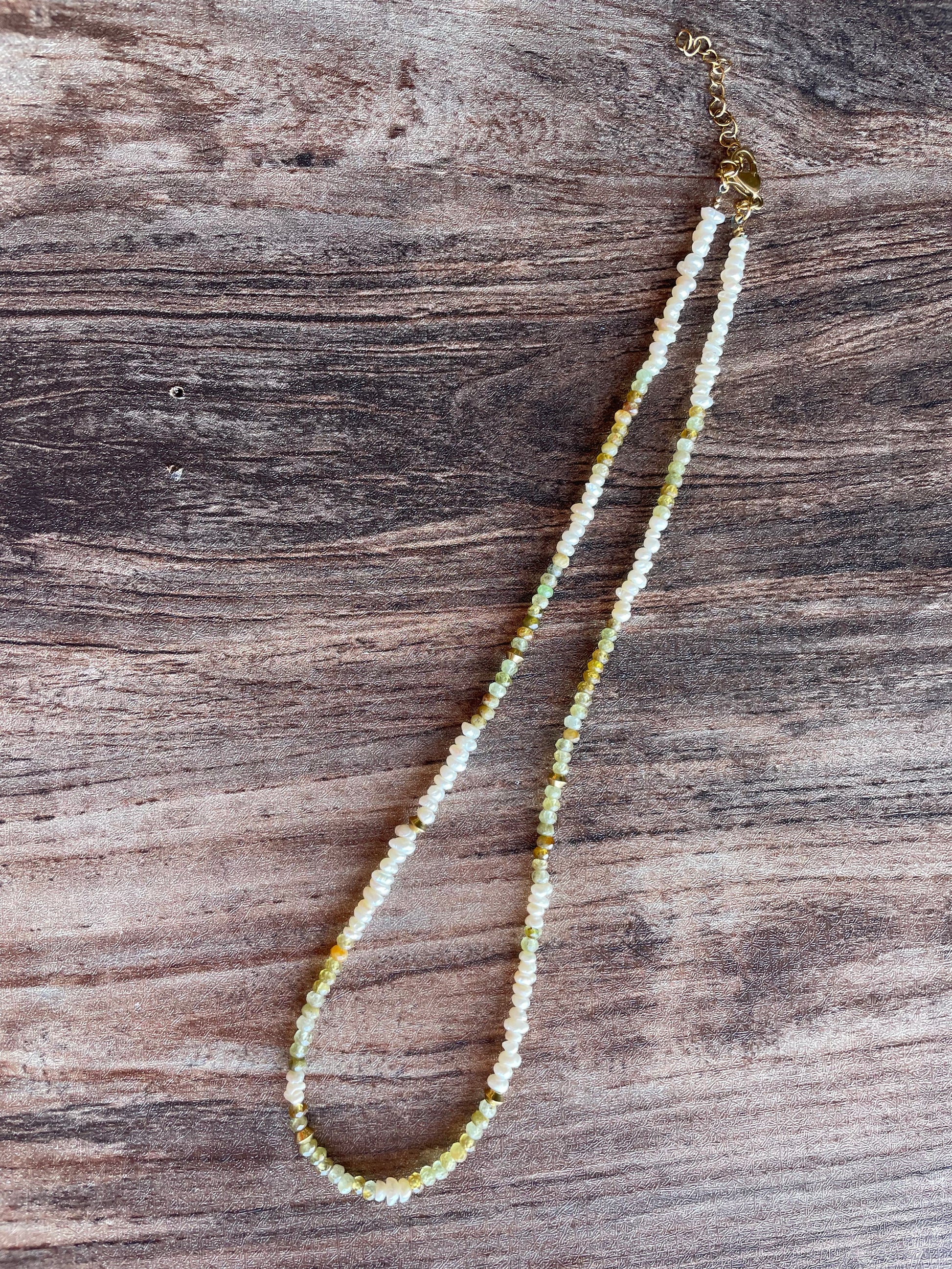 This delicate Freshwater pearls & Green Garnet necklace is a refined piece that adds a subtle elegance to any look. The fine beads, carefully strung together, create a timeless design that's perfect for layering or wearing alone.