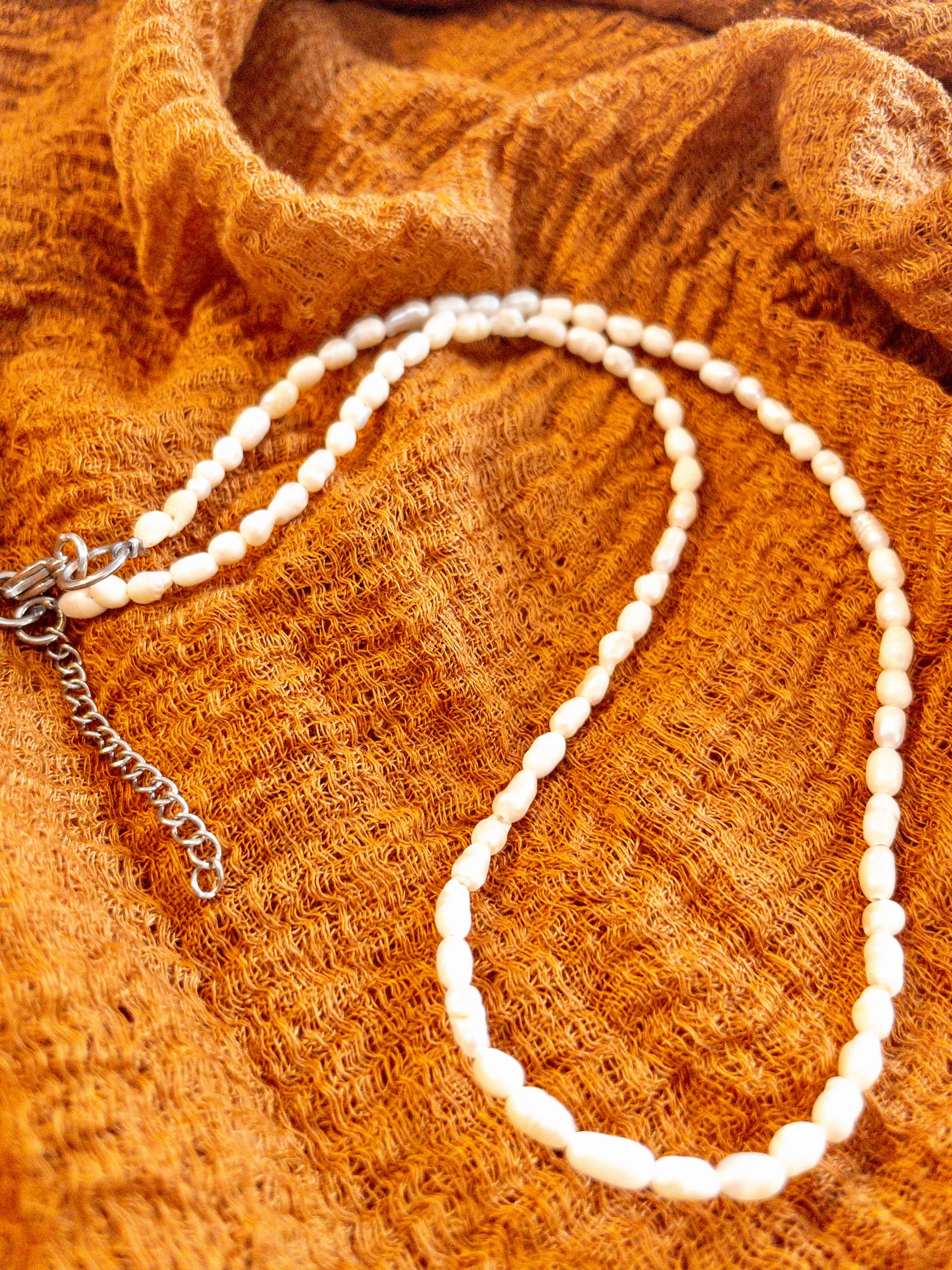 This necklace, available in both 18k gold plating and stainless steel, is elegantly crafted with a chain of luminous freshwater pearls. A modern take on classic pearl jewellery, this piece adds a touch of sophistication to any outfit.