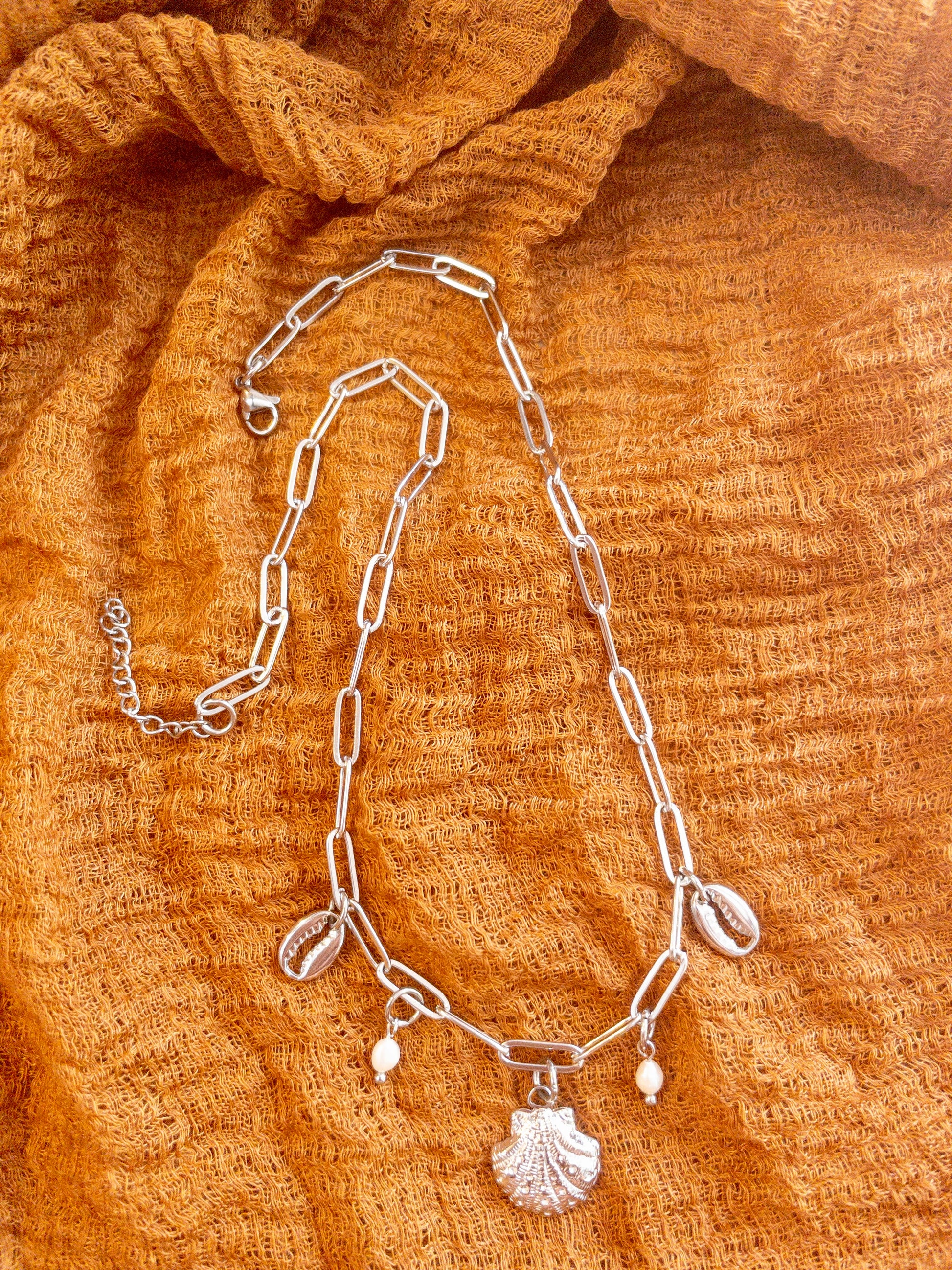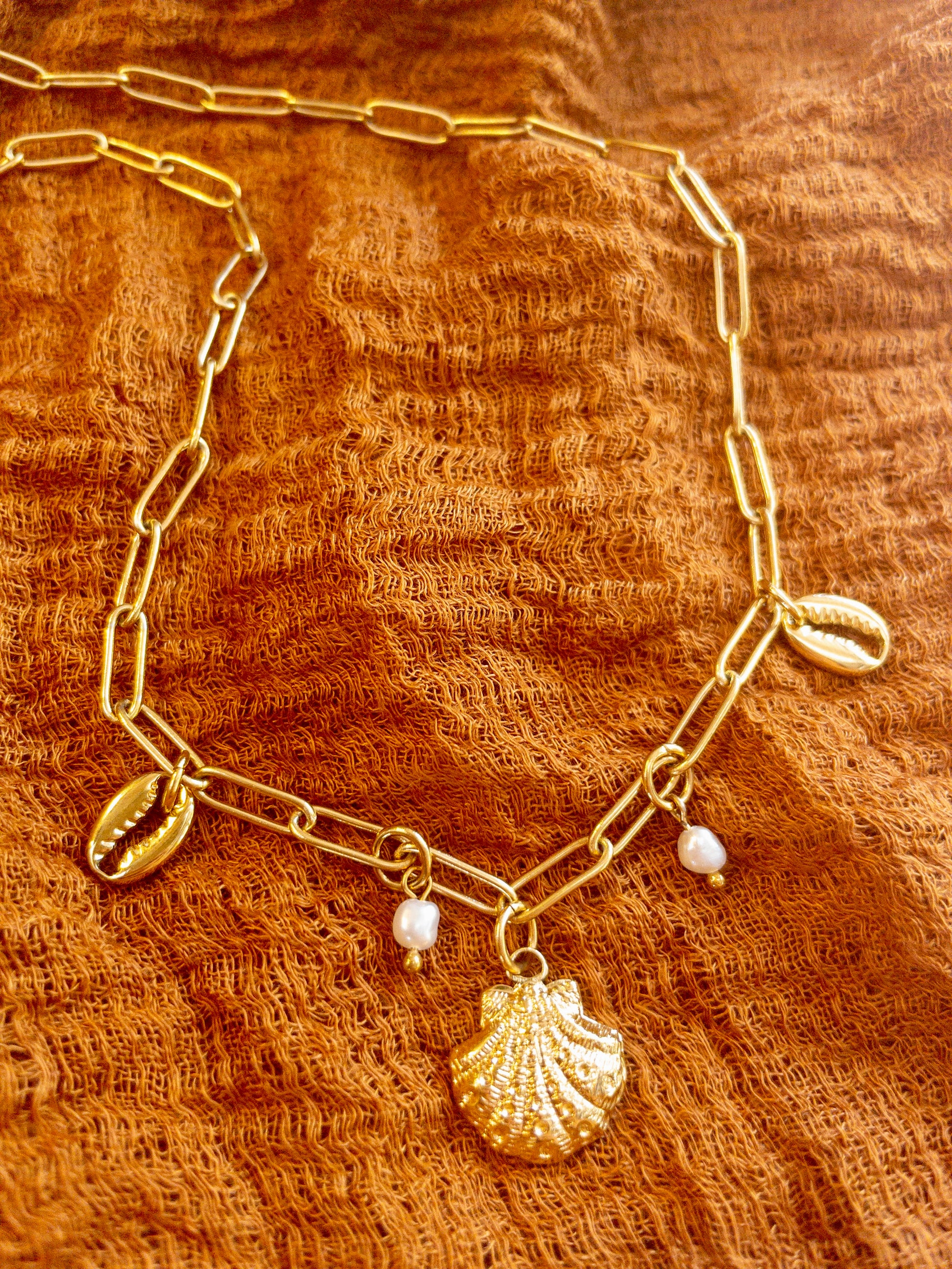 This necklace, available in 18k gold plating and stainless steel, features a delicate link chain adorned with seashells and freshwater pearl pendants. A perfect balance of coastal charm and timeless elegance, this piece brings a natural, effortless beauty to any look.