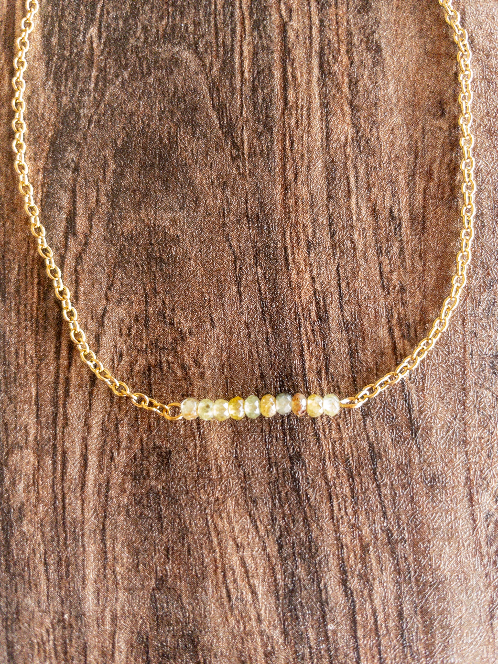 This 18k gold-plated necklace features a delicate cable chain adorned with green garnet crystals, adding a touch of natural elegance. The vibrant green hues contrast beautifully with the warm gold, creating a refined yet organic look.