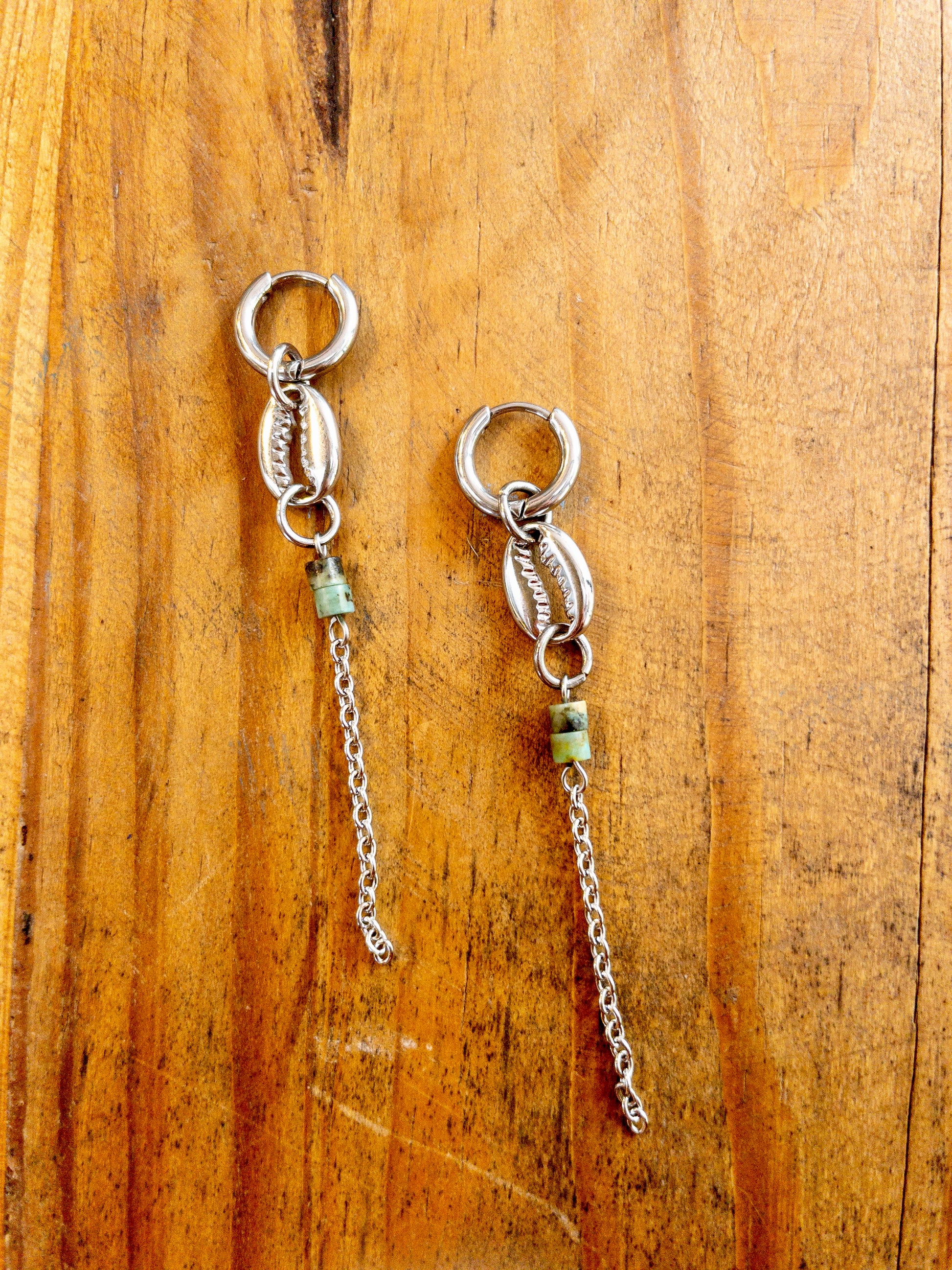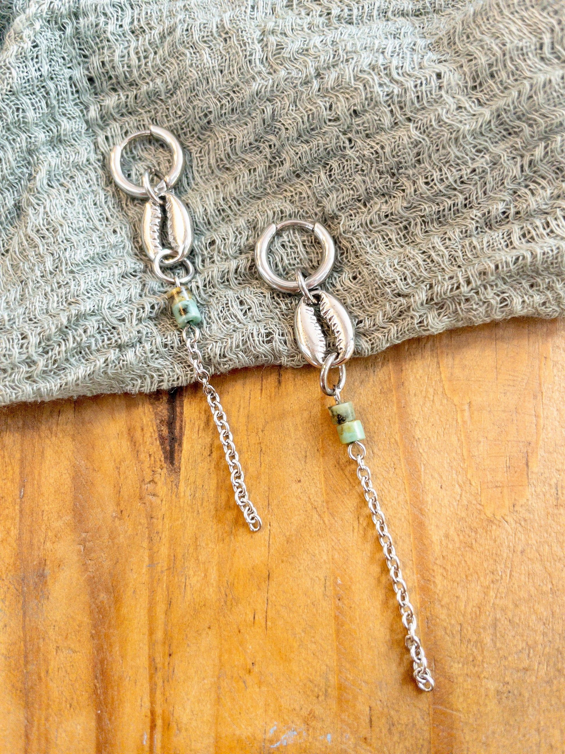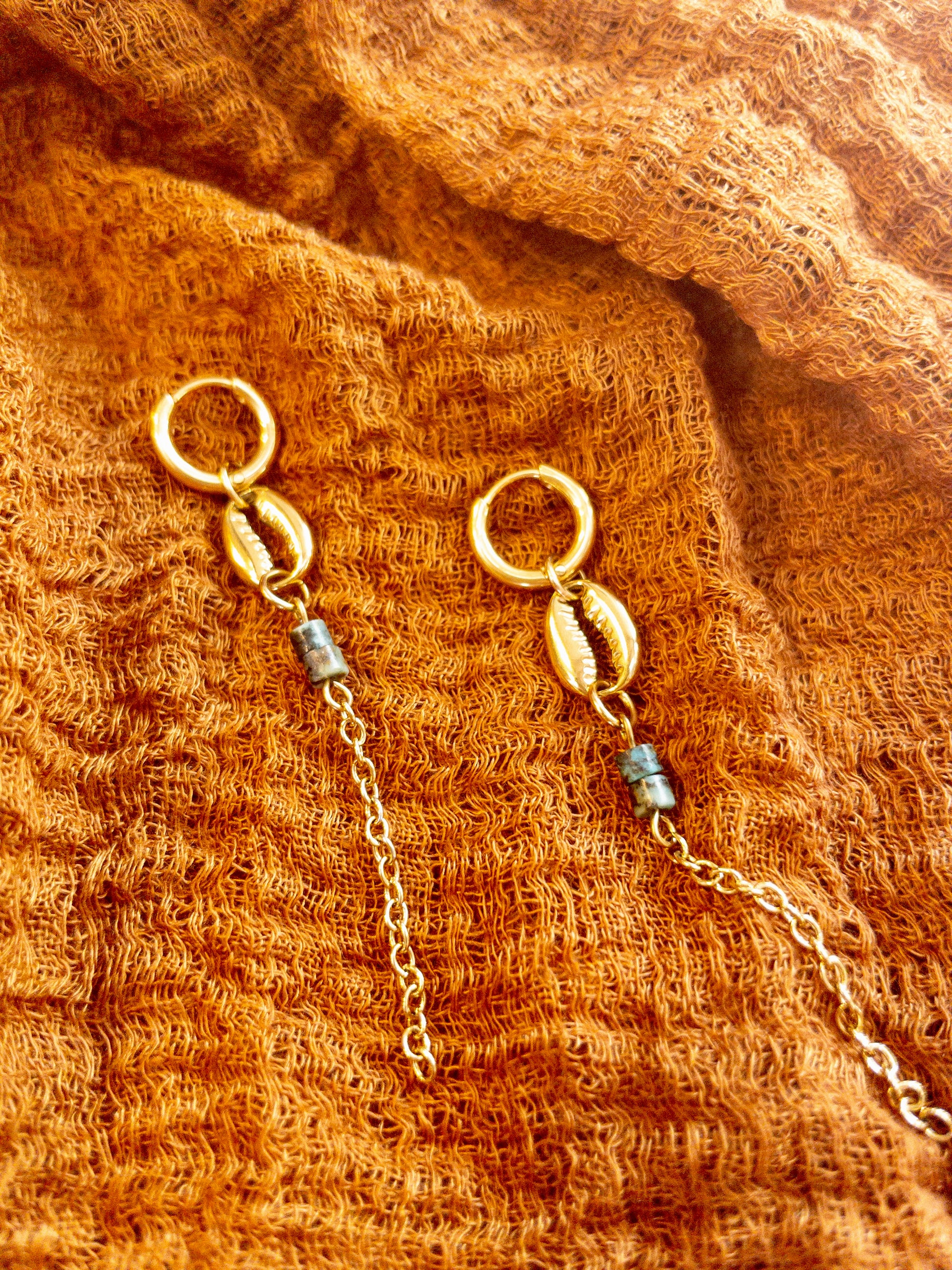 His pair of earrings, available in 18k gold plating and stainless steel, captures the beauty of the ocean with a delicate small hoop that suspends a natural cowrie shell charm. Beneath it, two small African Turquoise beads add a touch of earthy elegance, symbolizing transformation and growth. A fine draping chain enhances the design, creating a fluid, lightweight feel.