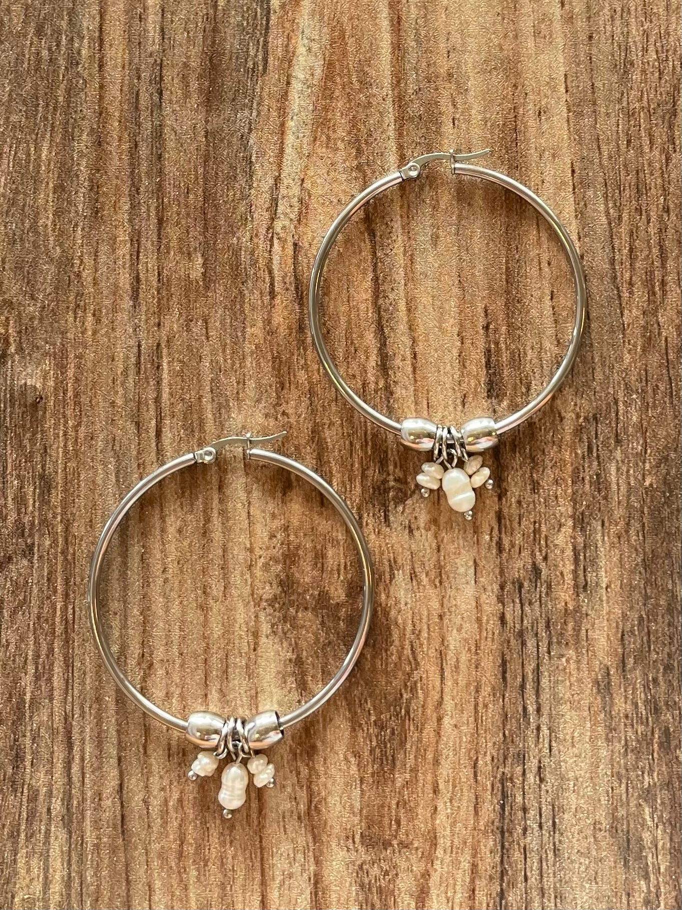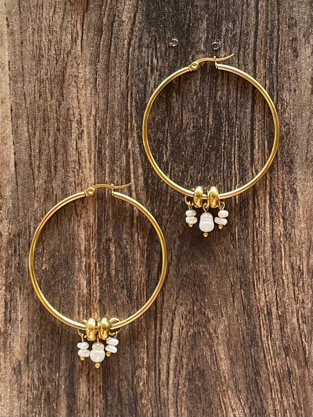 This pair of earrings offers a refined balance of elegance and simplicity. Available in 18k gold plating and stainless steel, the design features large, thin hoops with luminous freshwater pearls delicately suspended below. Lightweight and graceful, these earrings add effortless sophistication to both casual and dressy looks. Perfect for layering with other pearl accessories or wearing solo for a timeless statement.