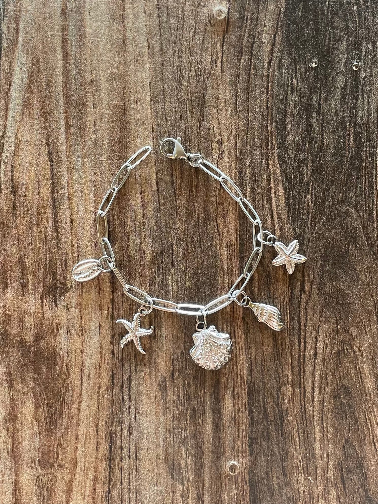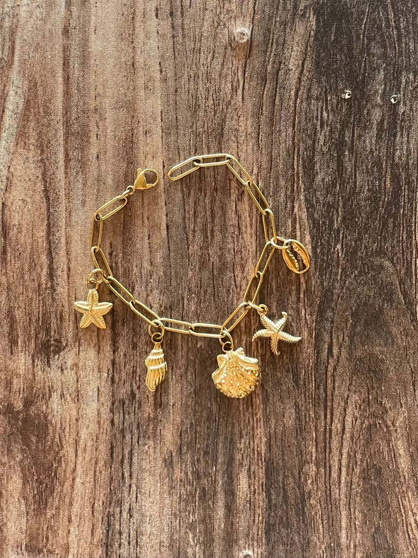 This bracelet, available in 18k gold plating and stainless steel, captures the essence of effortless elegance. A delicate link chain is adorned with 5 different seashell pendants, creating a subtle yet striking coastal charm.