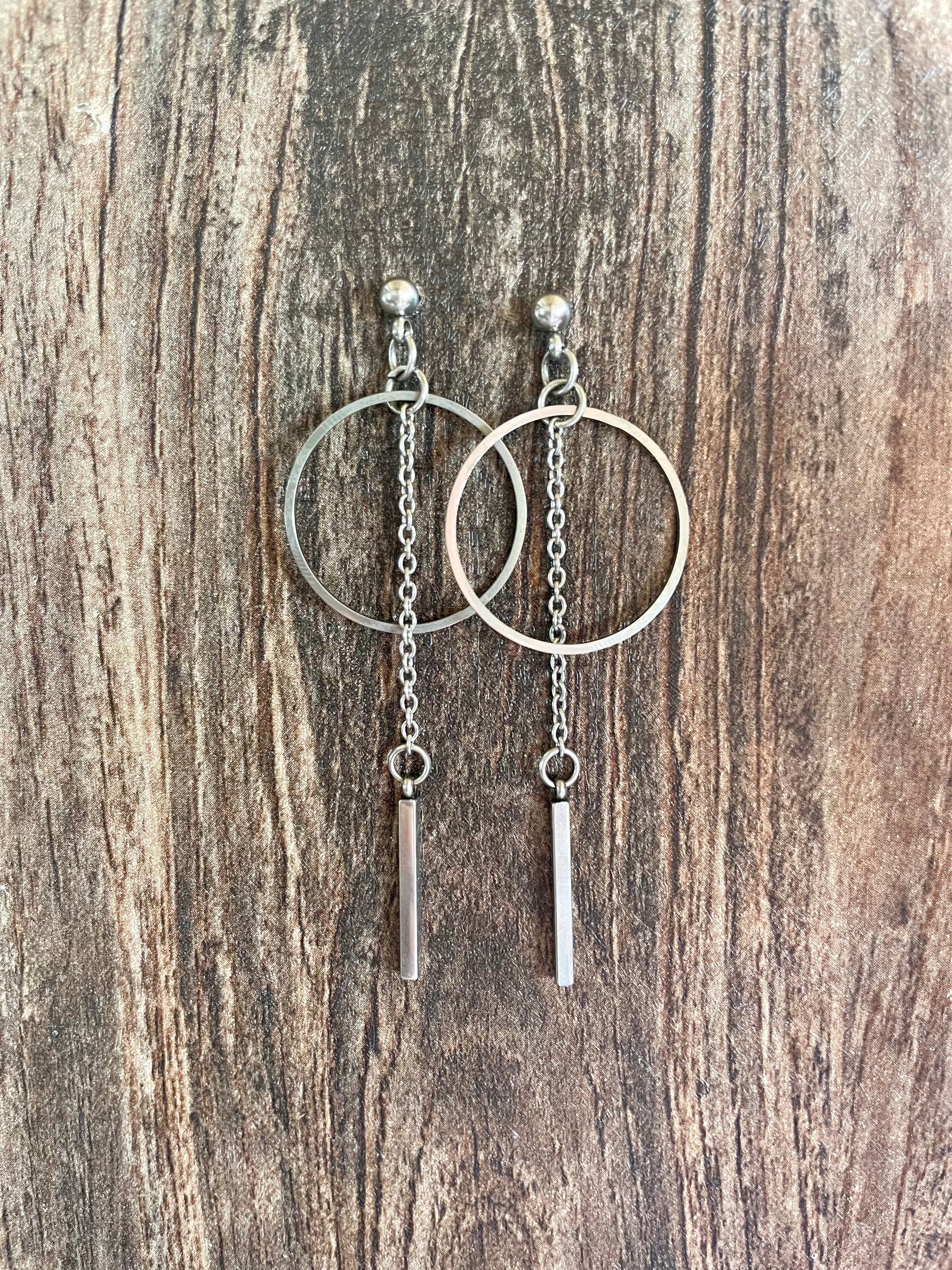 This pair of earrings, available in stainless steel, features stud earrings with a sleek circle that connects to a delicate chain, finished with a polished bar drop. Its minimalist yet edgy design makes it a versatile accessory, perfect for adding a modern touch to any outfit.
